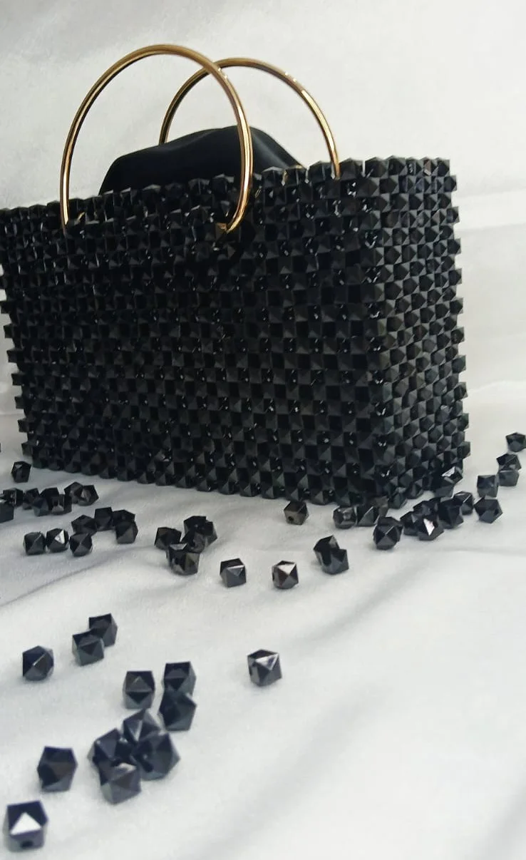 حقيبة "بلاك أونيكس" هي تحفة معمارية صغيرة صُممت للمرأة القيادية التي تعشق التصاميم الجريئة. تجمع بين سواد الخرز الكريستالي المضلع الذي يعكس الضوء بغموض أنيق، وبين المقابض الذهبية الحلقية التي تضيف لمسة فنية عصرية. إنها الحقيبة التي تنقل إطلالتكِ فوراً من “عادية” إلى “أيقونية”.