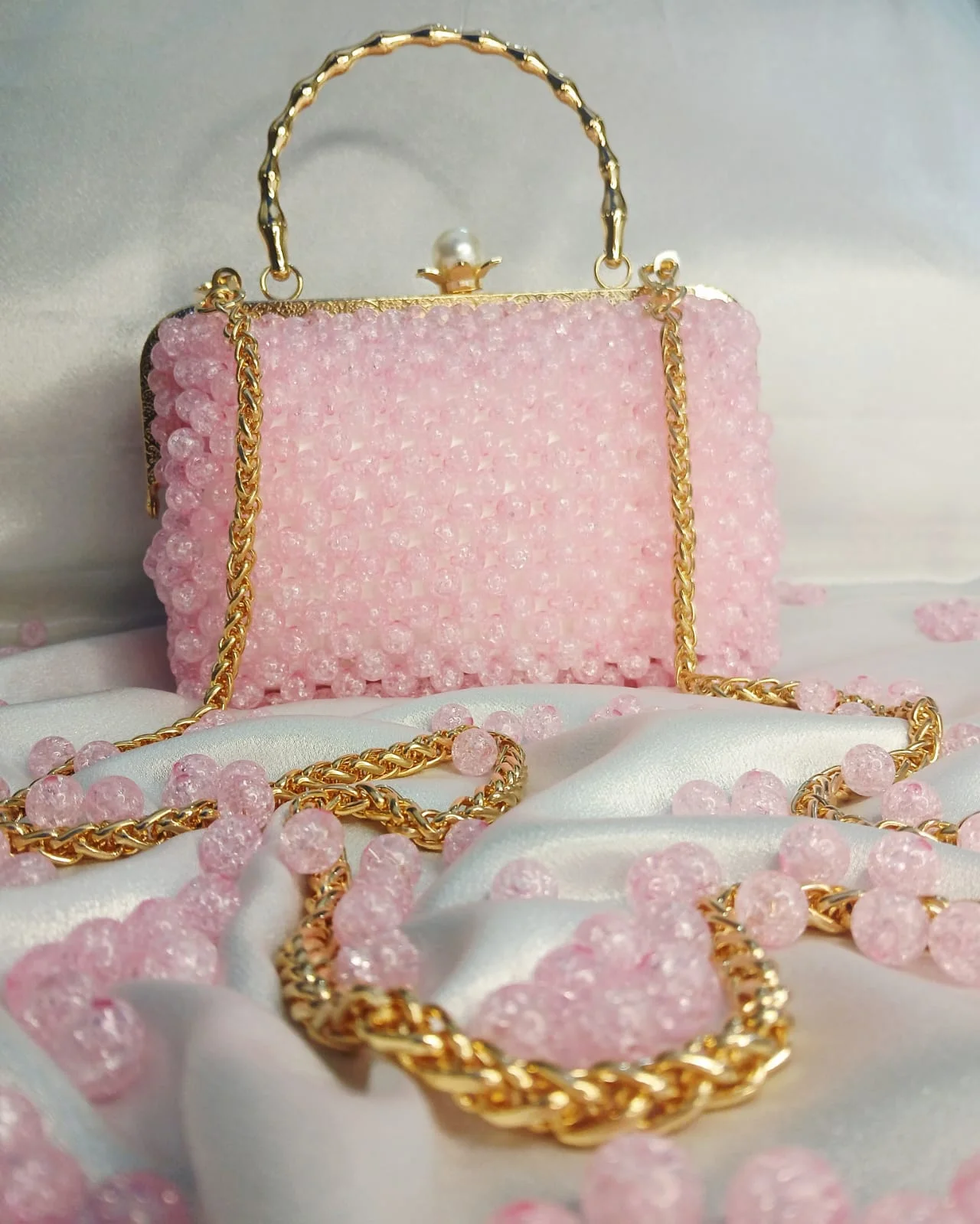 اللون الوردي الفاتح مع الملمس المبلور يجعل الحقيبة تبدو خفيفة ومنعشة للعين.