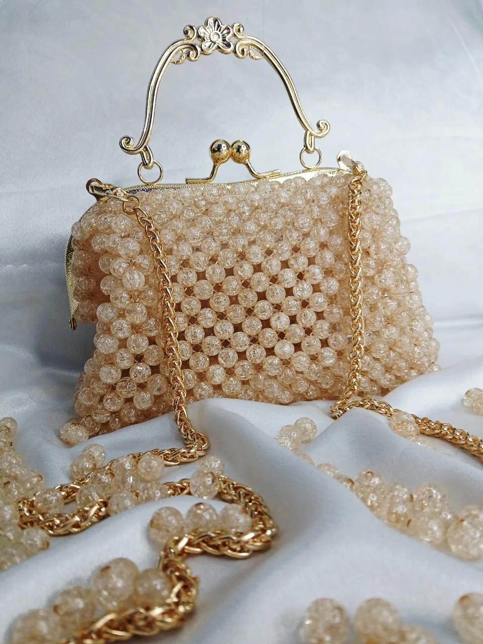 تخطف "شامبين كلاسيك" الأنظار فوراً بفضل مقبضها المعدني الفريد المصمم بشكل "مموج ومزخرف"، والذي يشبه تيجان الملكات القديمة. ينسجم هذا الإطار الذهبي مع حبات الخرز بلون الشمبانيا لتشكيل قطعة فنية تنبض بالفخامة والكلاسيكية. إنها الحقيبة التي ترفع من قيمة أي إطلالة ترتدينها.